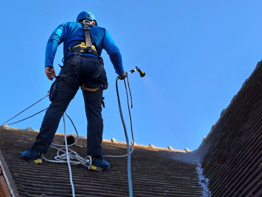 Sur ce bâtiment à forte pente, nos cordistes ont réalisé une recherche de fuite par mise en eau maîtrisée. Résultat : infiltration localisée avec précision sans démontage de toiture.