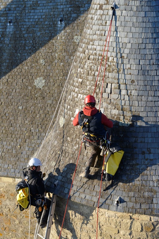 Deux cordistes sont intervenus sur une toiture en ardoise d’un bâtiment historique pour détecter une infiltration récurrente.